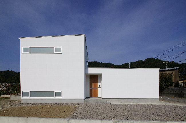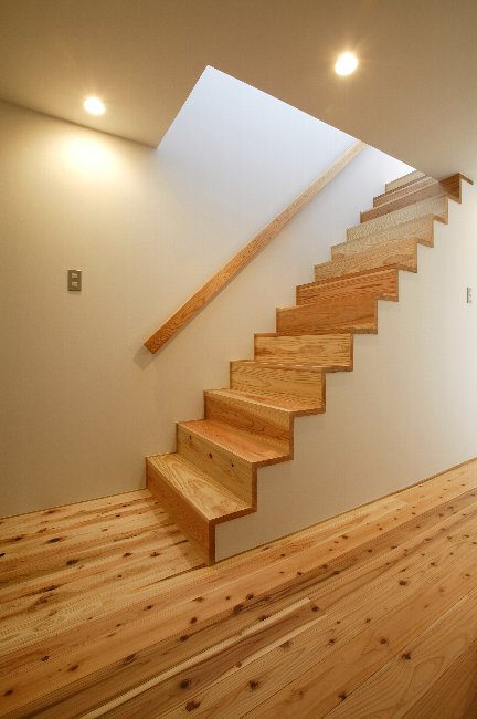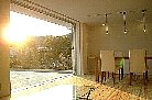 室内空間の床から延長となるテラス。1FLと揃ったことによって部屋が広く感じる。 無骨な素材であるセメント平板。これだけ広い面積になると表情が豊かで面白い。 内と外のつながりを超えた、内と外の裏返し「Inside-Out」という表現が相応しい。「明るく」「広々」=「快適」、といったステレオタイプ的で安易な手法ではなく、建築に限定され、コントロールされることによって立体的な空間の連続性の中に四季と背景の自然を通じ、外部と内部空間のつながりと拡がりを求める。